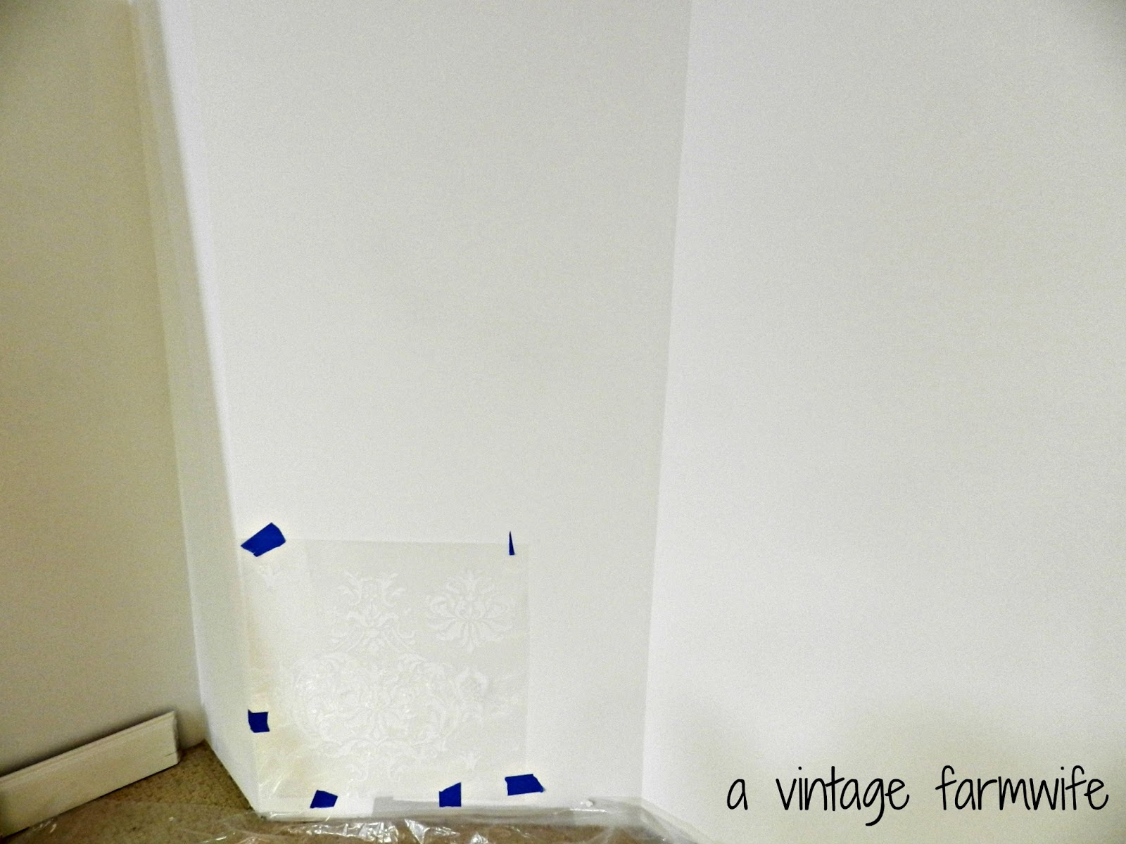 Four hands would have made this job easier. It was kind of hard at times trying to position the stencil, with the roller handle between my teeth, while standing on a chair.